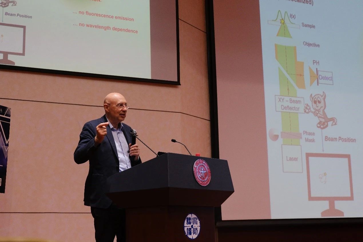 Hell教授的报告围绕着MINFLUX超分辨荧光显微镜展开。报告深入浅出,生动形象,系统介绍了MINFLUX的技术原理和应用,讲解了如何在较低信噪比的情况下得到小于1纳米的定位精度,以实现超高的光学分辨率。Hell教授将MINFLUX显微术使用的单分子定位技术比作精灵在控制环形的光束,将其中间暗点定位到荧光分子中,以实现单分子荧光的精准定位。