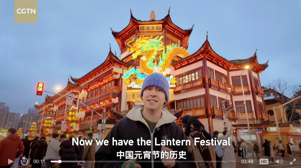 我校数学学院英国博士留学生Luke Johnston在上海豫园拍摄的元宵节灯会的短视频,被央视CGTN转载,并作为“老外看中国文明”封面故事推荐。