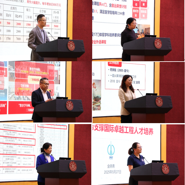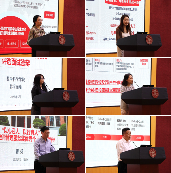 在答辩展示环节,医学院附属第一人民医院、基础医学院和教育学院的分管领导分别就单位的研究生教育工作情况、管理服务成效、人才培养创新等内容进行了全面汇报。13名研究生教务老师立足岗位实际,结合个人岗位职责、服务效能、工作创新及实际成果进行了精彩展示。